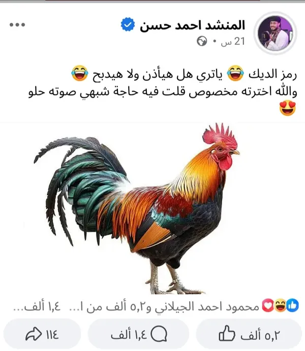 وعلق المنشد أحمد حسن، عبر صفحته الرسمية على فيس بوك، على رمزه بطابع ساخر وقريب من جمهوره على منصات التواصل الاجتماعي، قائلا :’ رمز الديك.. ياترى هل هيأذن ولا هيتدبح؟