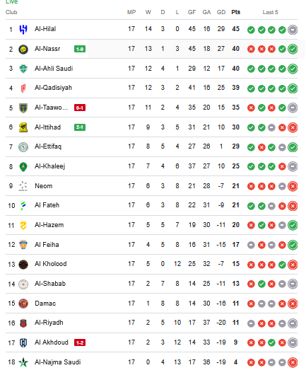 جدول ترتيب دوري روشن السعودي بعد فوز النصر والاتحاد ونهاية الجولة الثامنة عشر