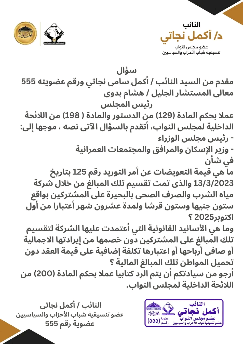 وطالب النائب برد كتابي رسمي على سؤاله البرلماني، وفقًا لحكم المادة (200) من اللائحة الداخلية لمجلس النواب، مؤكدًا ضرورة حماية حقوق المواطنين وضمان الشفافية في ما يتم تحميله على فواتير المرافق الأساسية.