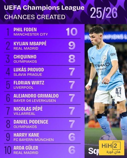 كما جاء فيرتز، نجم ليفربول، في المركز الخامس برصيد 7 فرص، فيما جاء غولر، لاعب الريال، عاشرًا برصيد 6 فرص.