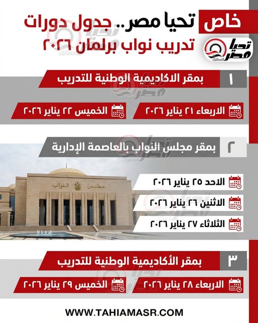 المرحلة الثانية: الأحد 25 يناير، والاثنين 26 يناير، والثلاثاء 27 يناير 2026، وتُعقد الجلسات التدريبية بمقر مجلس النواب الجديد بالعاصمة الإدارية الجديدة، والأكاديمية الوطنية للتدريب.