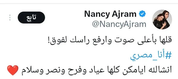 وكتبت نانسي في تغريدتها:’قلها بأعلى صوت وارفع راسك لفوق! أنا مصري.. إن شاء الله أيامكم كلها أعياد وفرح ونصر وسلام’.