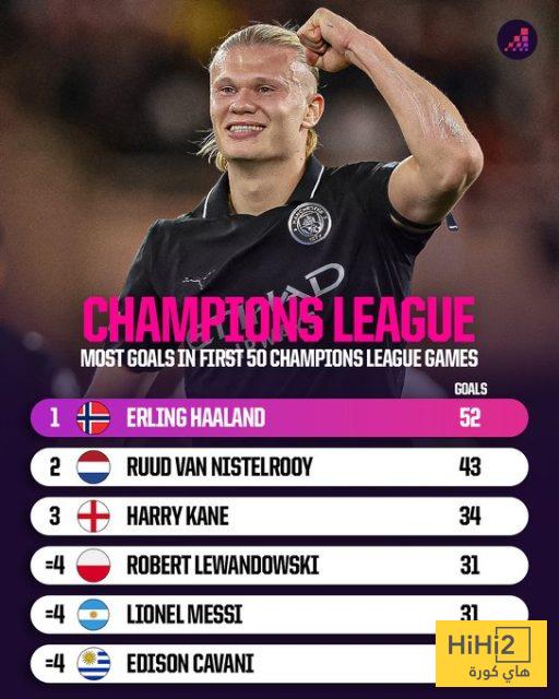 هالاند سجل هدفيه الـ 51 و الـ 52 في مباراته الـ 50، كأكثر من سجل في هذا العدد من المباريات بالبطولة الأوروبية ويليه كل من :
