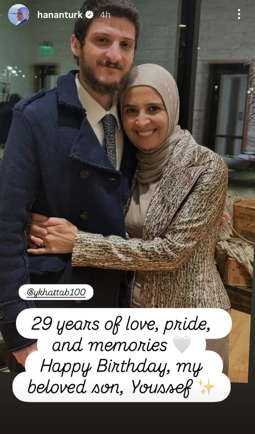 ونشرت حنان ترك رسالة لابنها رصدها موقع تحيا مصر قالت فيها: «29 سنة من الحب، الفخر والذكريات… عيد ميلاد سعيد ابني الحبيب يوسف»، في لفتة إنسانية نالت تفاعلًا واسعًا من جمهورها ومحبيها، الذين انهالت تعليقاتهم بالتهنئة والدعاء له بالسعادة والنجاح.